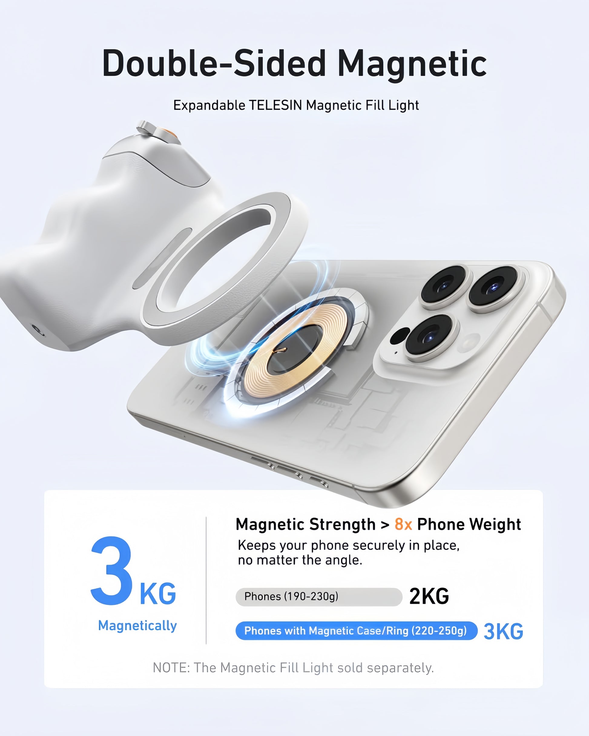 🧲 Strong Dual Magnetic Mounting Power: Built with dual high-strength magnets for a firm, stable hold on MagSafe-enabled phones or MagSafe-compatible cases. Supports up to 3KG of weight—keeping your phone secure even during active movement or fast shooting sessions.